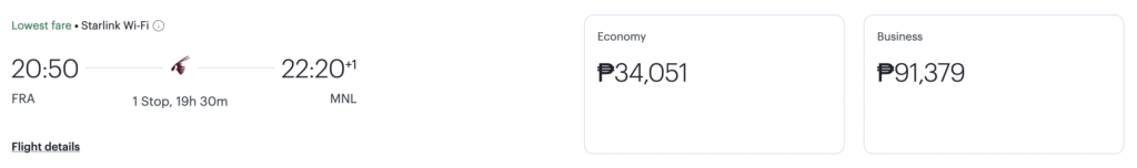With the assumed rate, cheapest economy would be 18K PHP and for business 54K PHP