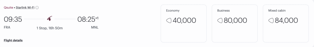 Lowest fares & points available as of writing 19-Nov-2025 via Qatar Airways