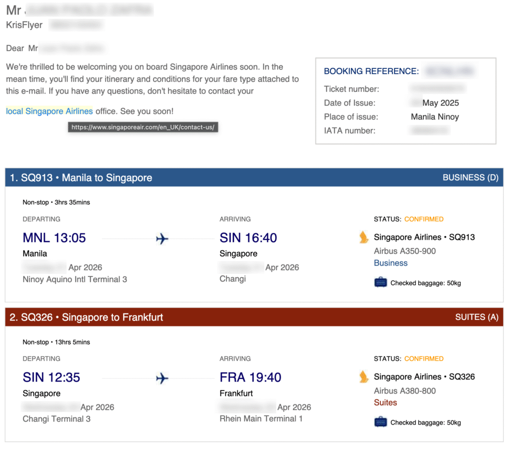 For the almost 3 months, I have been contemplating if I should redeem and experience Suites by Singapore Airlines (one-way), or use the pooled miles to redeem roundtrip business class. So its either experience vs. potential savings. Roundtrip business between MNL-FRA is approximately 4K EUR 💸 So yeah its not a joke.